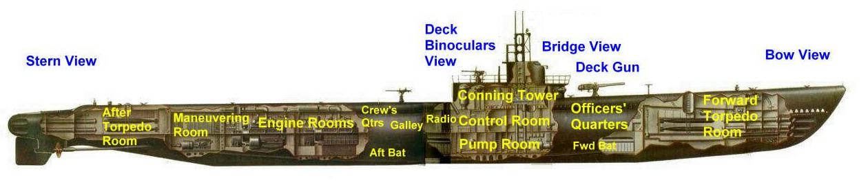 The diagram below is of a typical Gato/Balao class sub. The photos were taken of the USS Bowfin (SS-287) in April, 2000. The Bowfin, is a Balao class sub and is on display at Pearl Harbor.